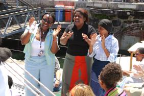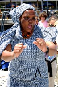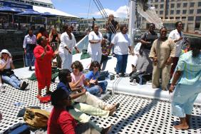| After some time of sharing, the singing and dancing began. The depth and magnitude of the pain these women face was matched by the joy and exuberance with which they sang and danced! It was pure delight to watch. The Capetown locals must have been quite surprised as they strolled along the busy dock to see 30 ladies from a village teaching 16 Americans how to sing and dance on a catamaran! |